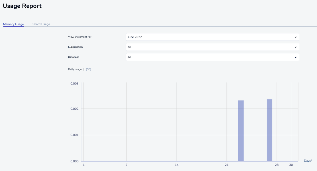 The Usage Report shows the daily memory usage and shard usage of all databases from the subscriptions associated with your account.